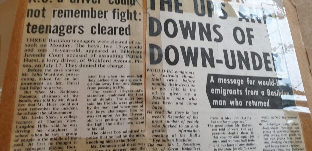 During that week I did the emergency rounds – police, fire and ambulance; sorted out and wrote up recollections of older townsfolk from the war (including the rector and his family who were unscathed when the rectory was hit by a bomb); wrote up my fist story on the battle between older residents and the Basildon Corporation over compulsory purchase orders; interviewed a businessman who had been dumping rubbish bags at the council offices because thy hadn’t put up proper signs to the tip and people were dumping rubbish in his boatyard; and even interviewed a 70-year-old man who had recently returned from Australia, where he had lived for five years, and said it wasn’t as good as it was cracked up to be (the previous week the paper had reported on the large number of people who had turned up at a meeting about emigration).