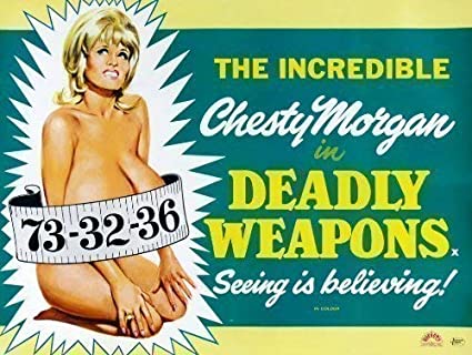 It was surprising how often that happened and we did have a run of five or six weeks when the same film appeared to be following us around from one town to the next and it was not a film that appealed to either of us – it was called Deadly Weapons and starred the oddly-named Chesty Morgan.